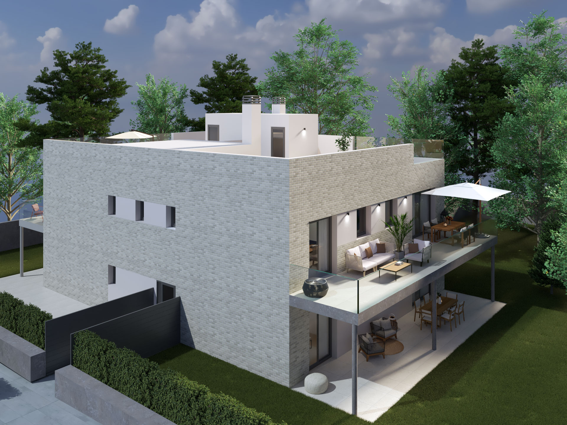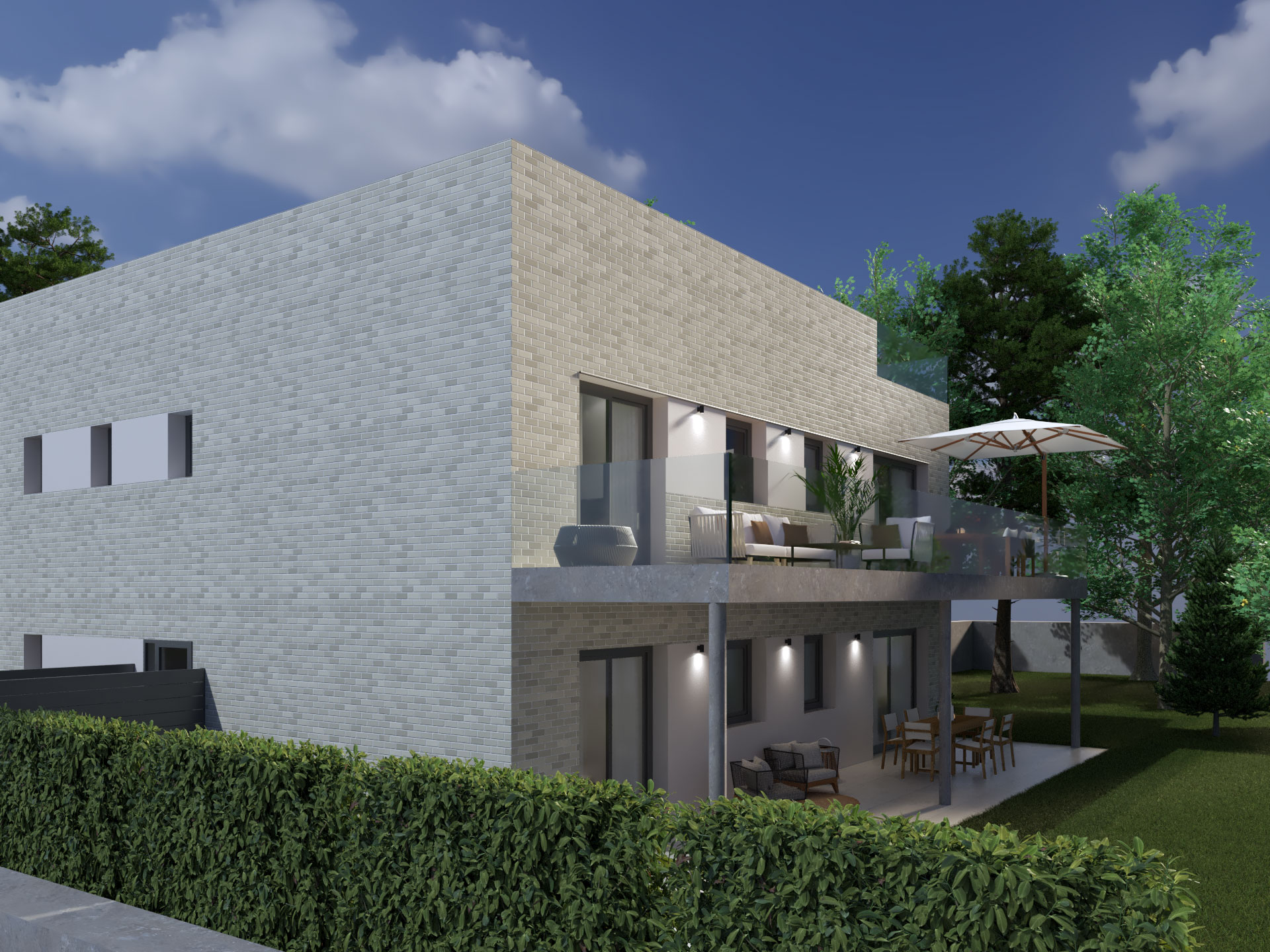 El projecte està format per dos edificis aïllats, cadascun amb planta baixa i primera planta, amb un total de 8 habitatges —dues vivendes per planta. Les plantes baixes disposen de jardí privat, creant espais únics i agradables per gaudir del clima i l’entorn, amb una gran zona comunitaria amb piscina.